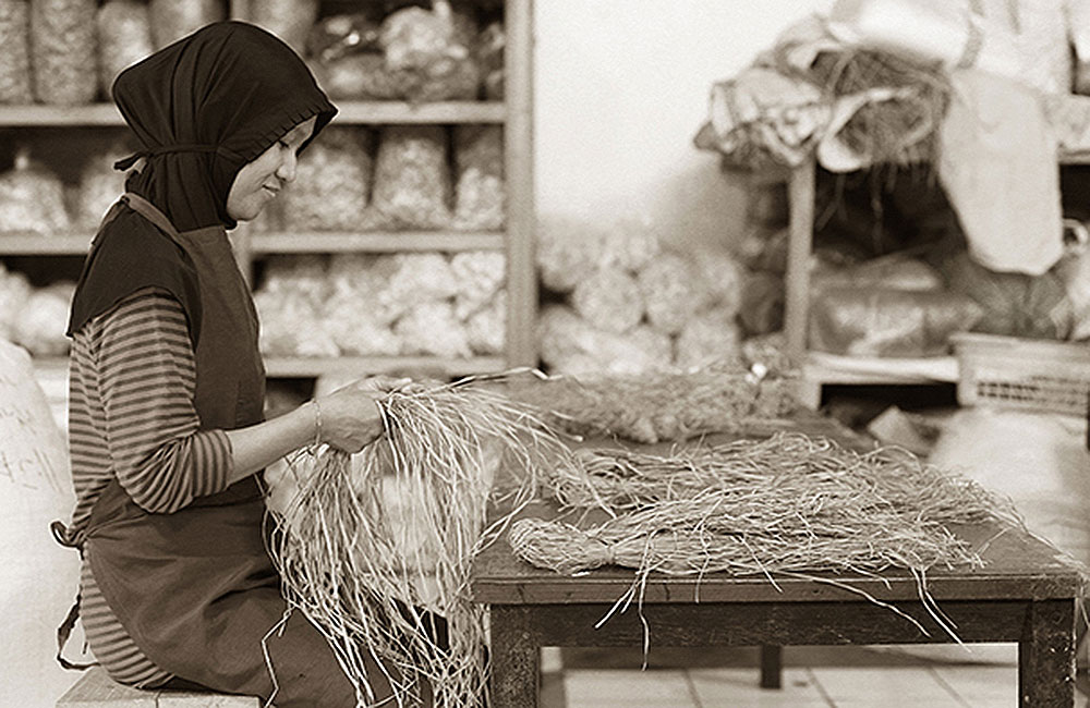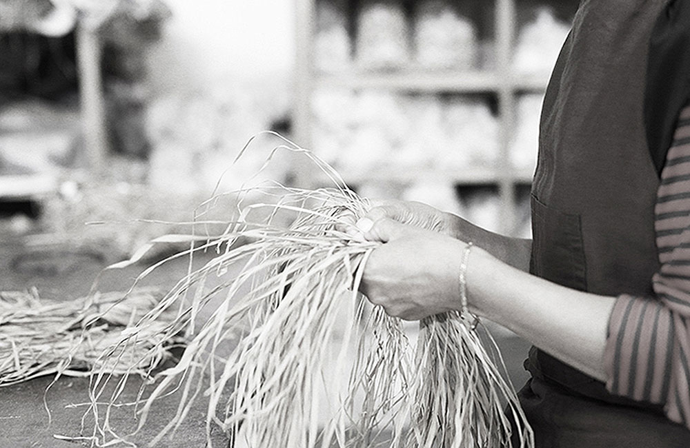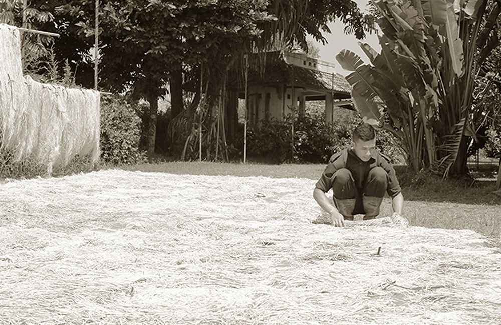 The natural fibers which are used for the production of our wall coverings are fibers from Abaca, which is cultivated in North Sulawesi where sun and sea harmonized in tropical islands and Raffia from East Java, the place of ancient Javanese kingdom. These fibers are shredded piece by piece in handwork by the villagers surround our weaving house. This shredding process is all about patience and careful attention.