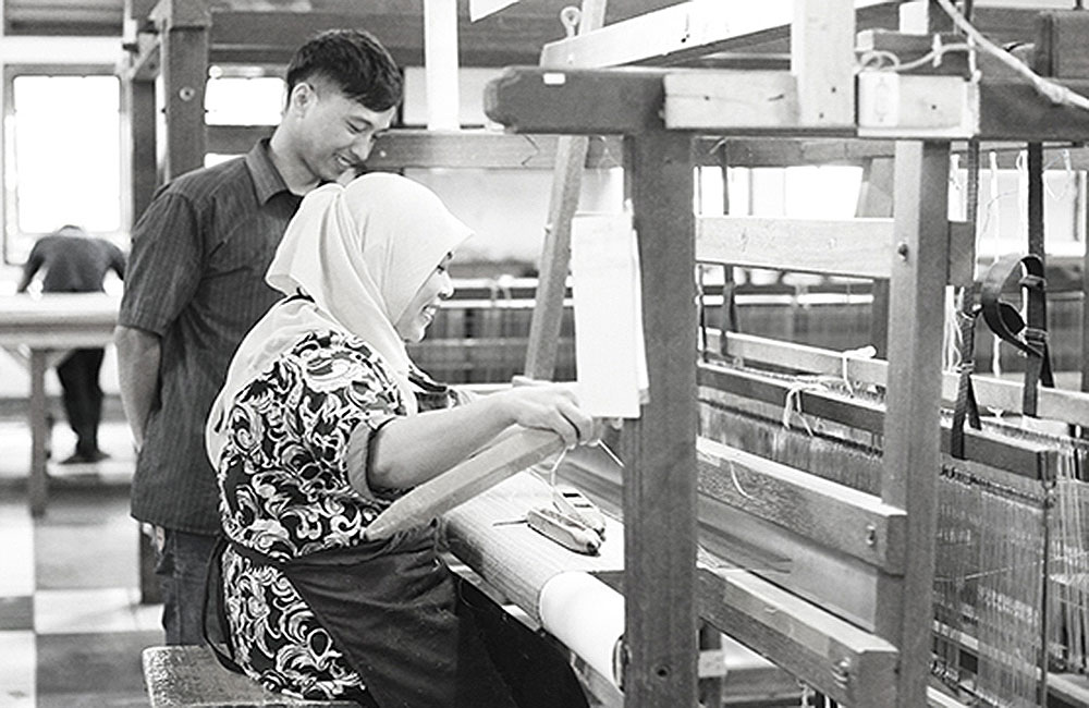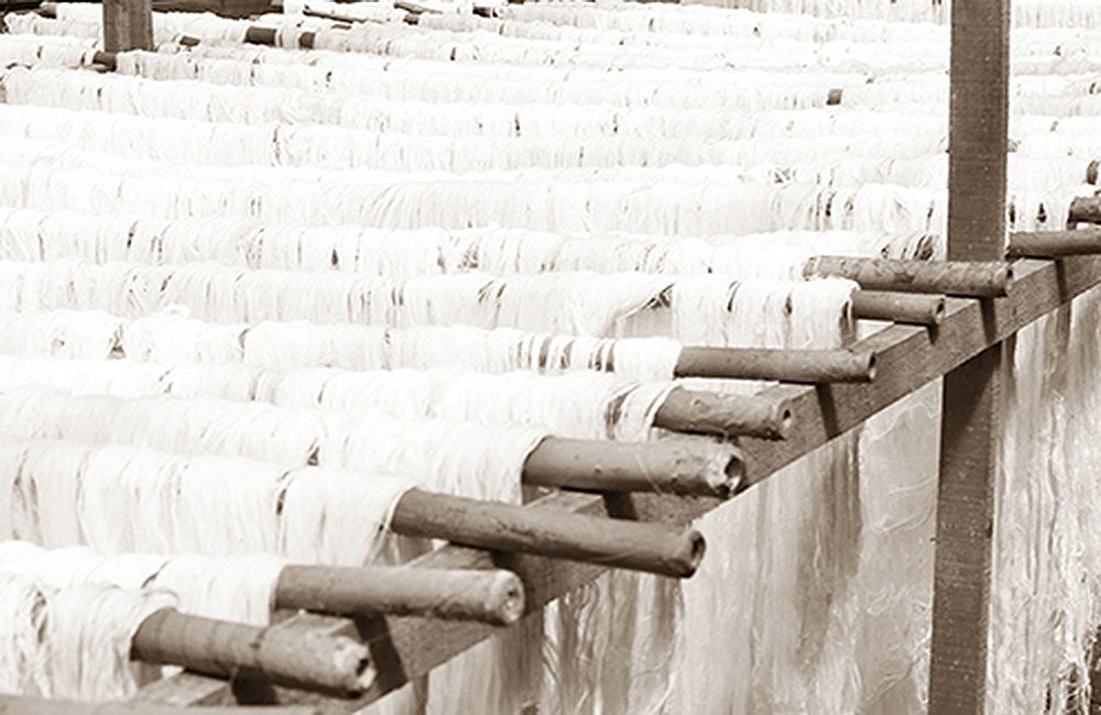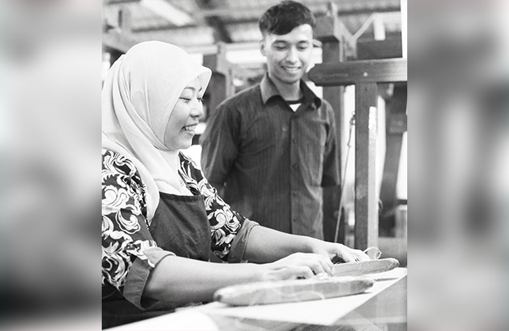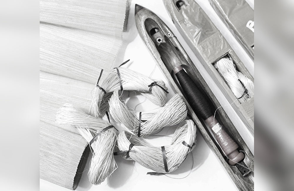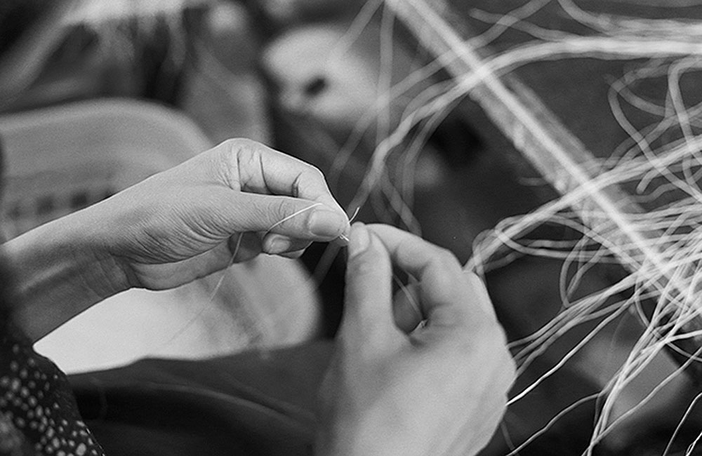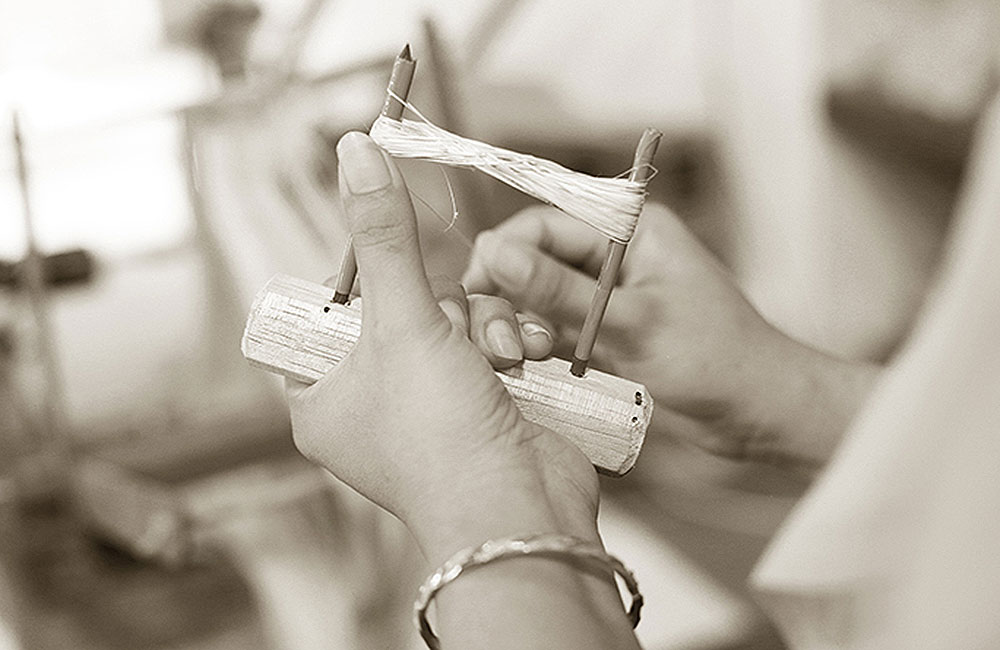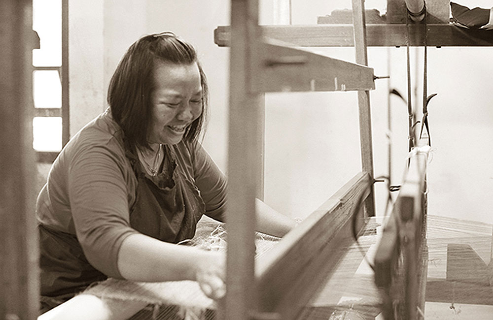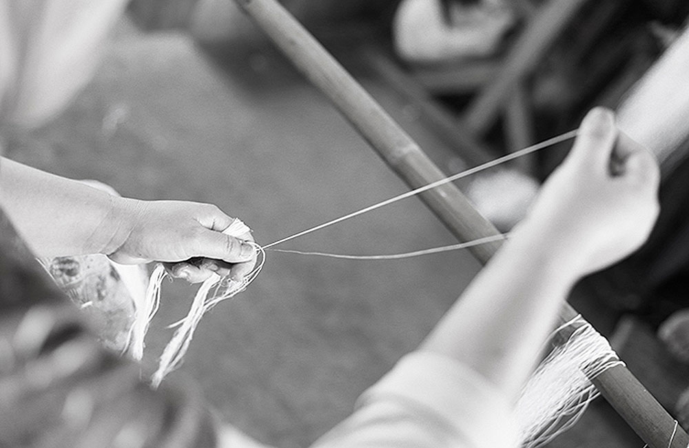 In the next steps the fibers are knotted one by one by careful eyes and skillful fingers to create a continuous fiber. There is story in every knot in the fiber. Story about their skillful craftsmanship woven in traditional culture. A priceless cultural heritage delivered in a simple message of sophisticated texture of wallcovering. The fibers are woven with a traditional hand loom. One by one, fiber by fiber is hand woven by the artisans in the weaving house. This precision work requires a lot of experience, diligence and patience from the weavers. Thorough quality control is included in every step of the production process to assure the best possible result.