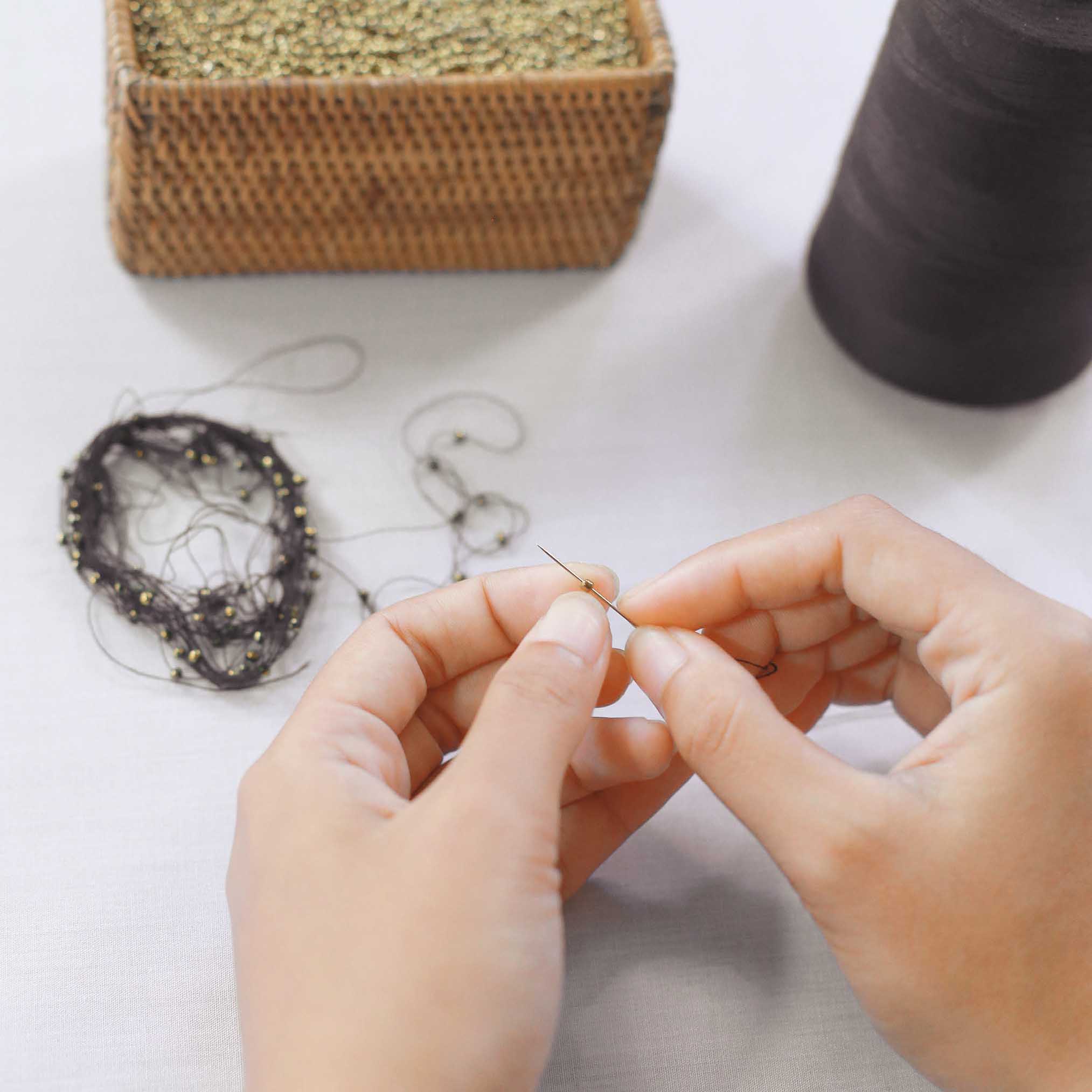 This bond is beautifully interpreted through the interweaving of hand knotted Raffia fibers, meticulously handcrafted by our artisans, and the beadwork woven into motifs inspired by the Ulos Ragi Idup.