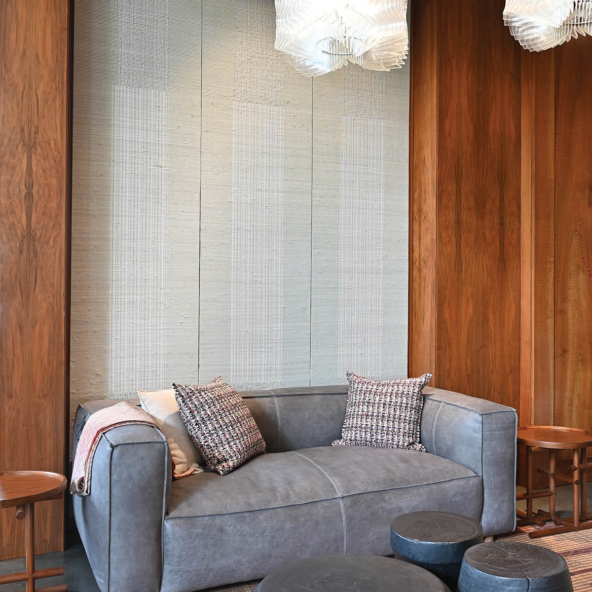 The arrangement of this motif, tailored to complement your walls, creates a bespoke wallcovering that adds contemporary texture and patterns.